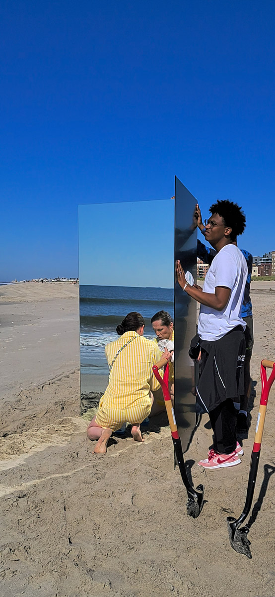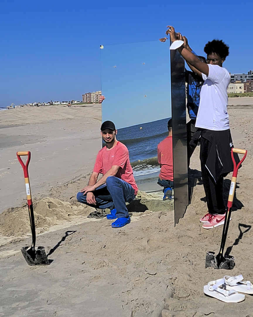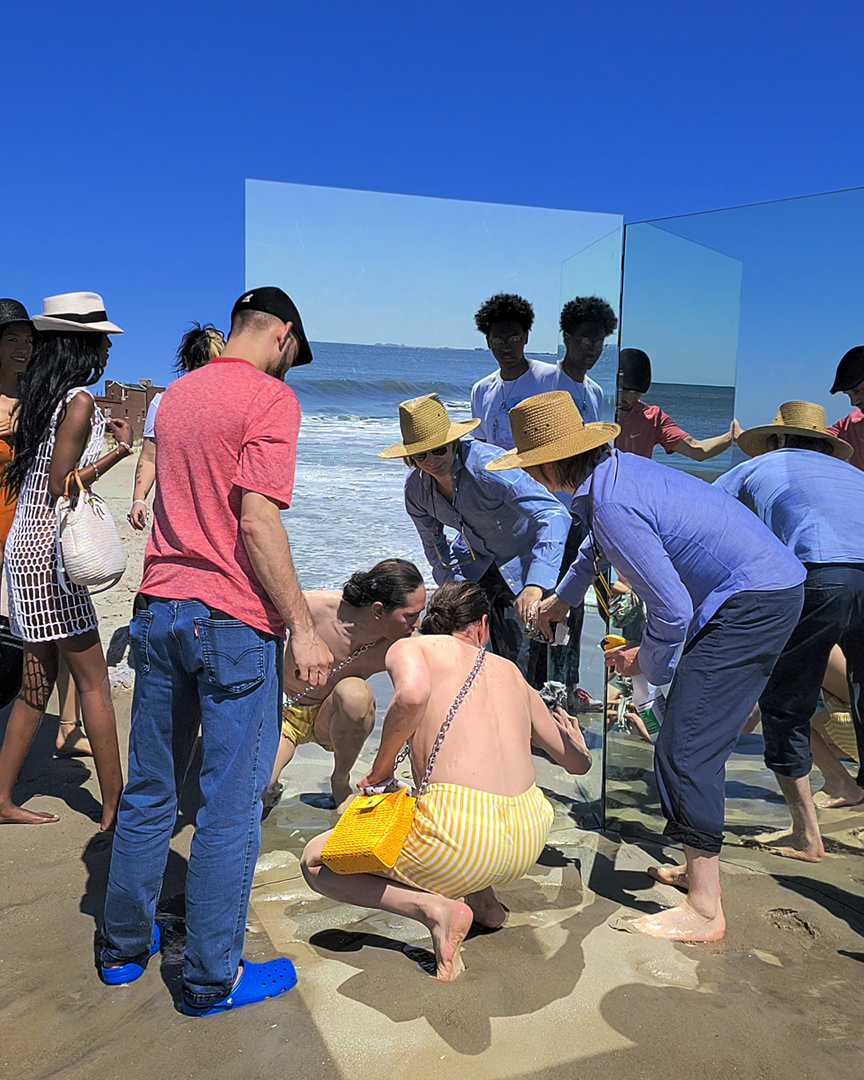 Venturing beyond Miami’s borders, an exquisite photoshoot unfolded on the sandy shores of Queens NYC on a radiant sunny day. The scene was set with a unique concept—a set of mirrors strategically positioned at a 45-degree angle to eliminate unwanted reflections. This clever technique ensured a pristine and captivating visual experience for the models adorned with an array of exquisite hats.